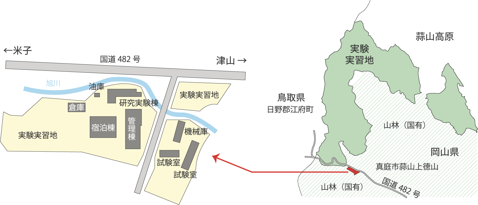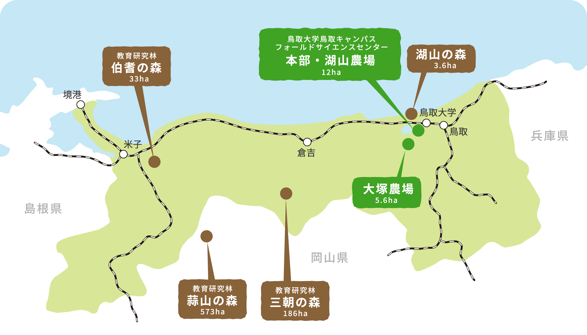 農学部附属フィールドサイエンスセンターは、農学部附属農場と附属演習林を前身とします。農学部附属農場は1920年(大正10年)鳥取高等農学校に実験実習農場が設置されたことに始まり、1966年(昭和41年)の鳥取大学統合移転に伴い、現在の湖山地区に移りました。附属演習林は、最も歴史のある蒜山演習林が1954年(昭和29年)に岡山県真庭郡川上村(現岡山県真庭市)に設置されました。