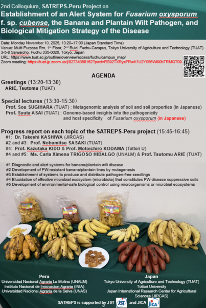 バナナは日本の食卓を彩る農作物の一つであり、日本で消費するバナナのほとんどが海外から輸入されたものです。しかし、近年、バナナの栽培が植物病原菌(Fusarium oxysporum f. sp. cubence レースTR4)による萎凋病の発生により、その生産・供給が不安定となっています。本病の被害発生が認められていないバナナ生産地は常にその脅威に曝されています。この脅威に立ち向かうため、科学技術振興機構(JST)と独立行政法人国際協力機構(JICA)が研究開発マネージメントする地球規模課題対応国際科学技術協力プログラム(SATREPS)の一つである「バナナ萎凋病の診断・警戒システムと発病制御戦略の構築と実装」プロジェクトが2022年から始まりました。本プロジェクトは東京農工大学が中心となり、鳥取大学、国際農林水産業研究センター(JIRCAS)、本病のパンデミックが迫っているペルー共和国の大学などが参加しています。本プロジェクトには5つの課題(1.病害診断技術の確立、2.バナナ健全苗の安定生産技術の確立、3.バナナ病害抵抗性品種の作出、4.病害抑止土壌の探索、5.微生物による防除技術の開発)があり、各組織の研究者や学生が研究に勤しんでいます。